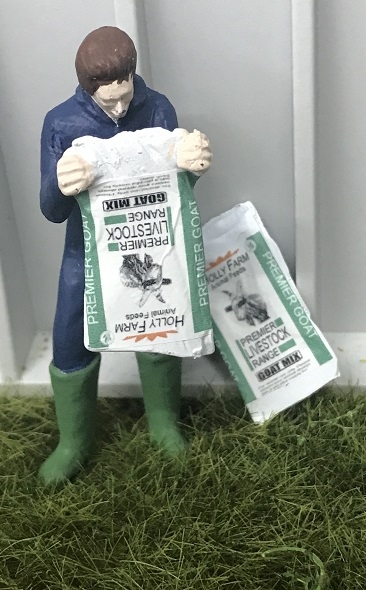 Farmer emptying a bag of goat food