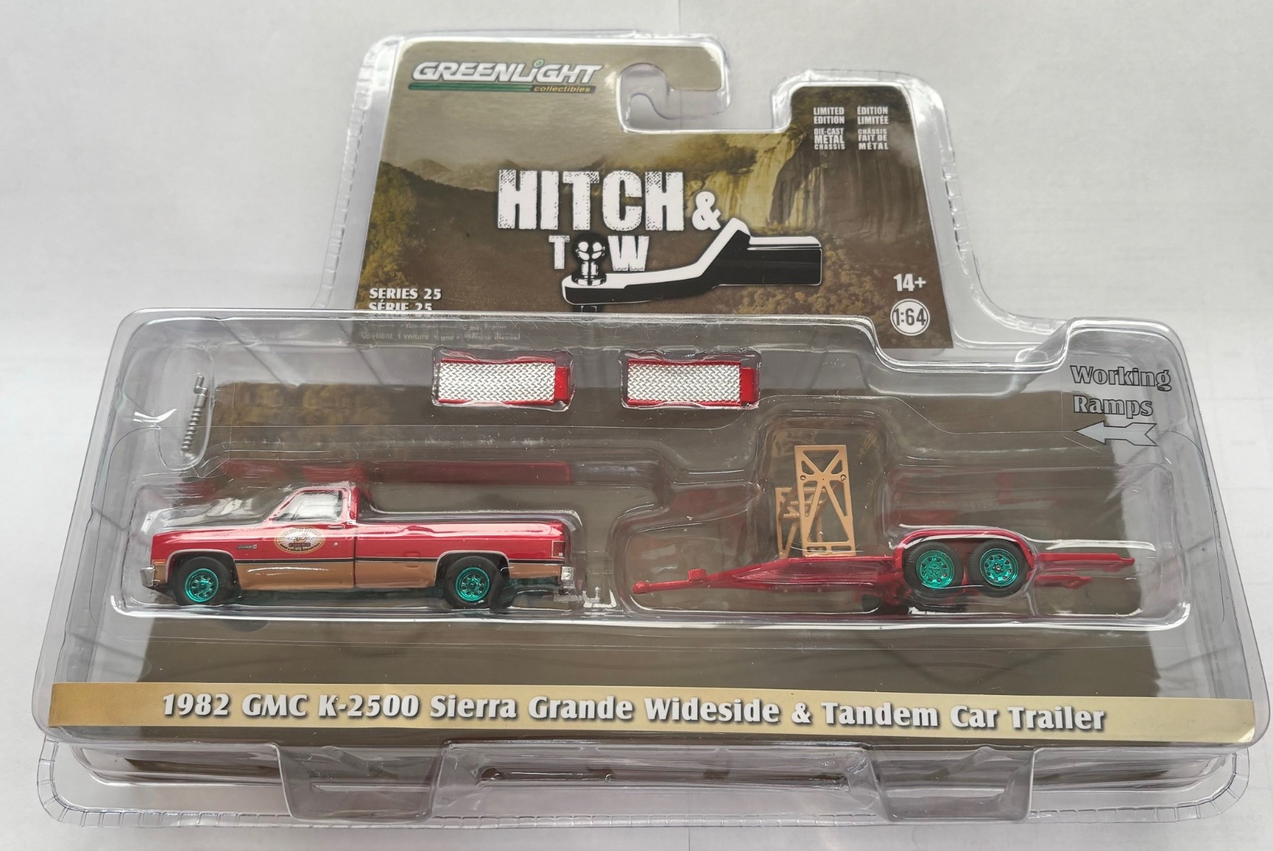 GMC K-2500 Sierra grande Wideside 1982 red with green rims and car carrier trailer from the HITCH & TOW series in blister pack